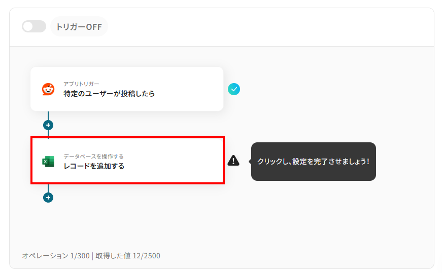 - 最後に、オペレーションでMicrosoft Excelの「レコードを追加する」アクションを設定し、Redditの投稿内容が指定のファイルに追加されるようにします