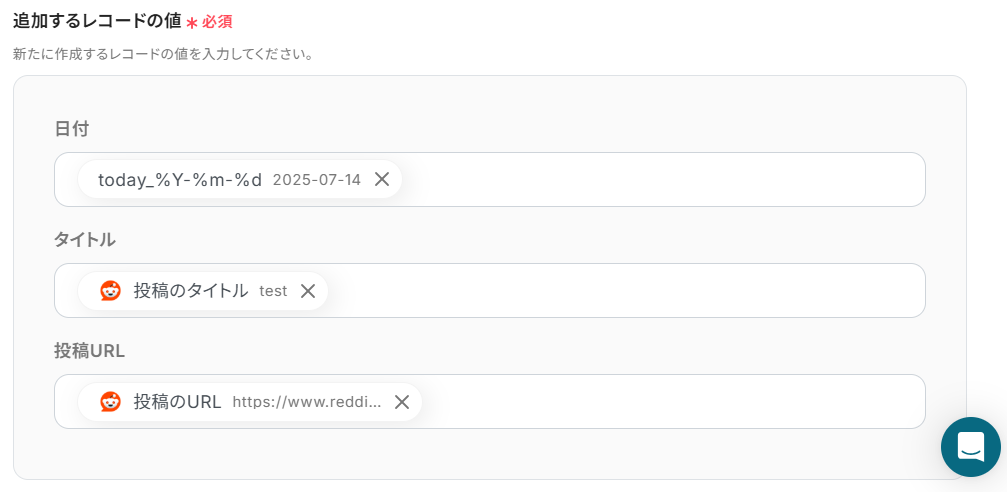 - Microsoft Excelへのレコード追加オペレーションでは、どの列にどのデータを追加するかを自由に設定できます。Redditから取得した投稿のタイトルやURLといった動的な値を変数として埋め込むことや、固定のテキストを入力することも可能です
