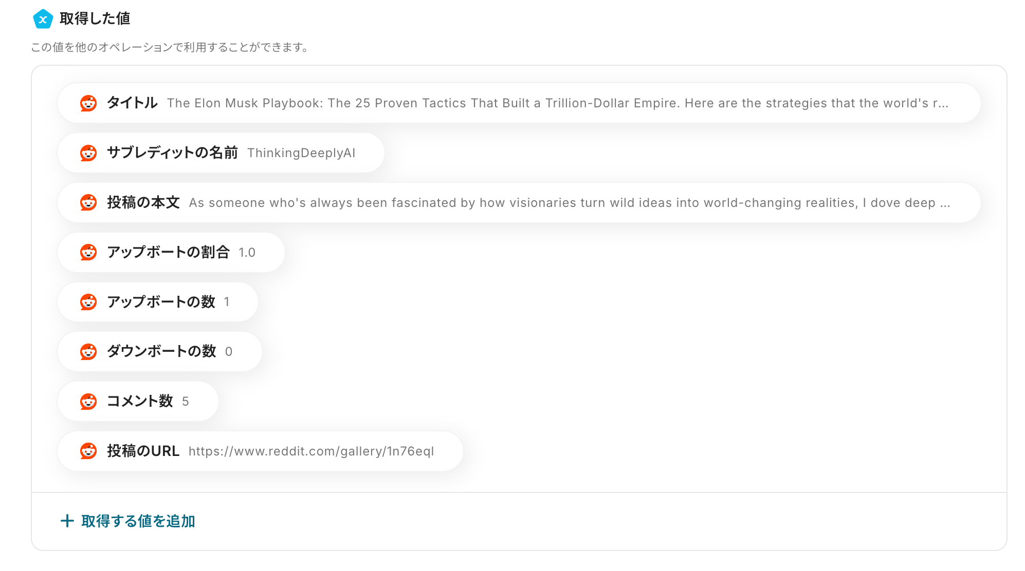 設定が終わったら、「テスト」をクリックしてRedditの投稿を取得しましょう。今回は以下のようなポストを取得しています。