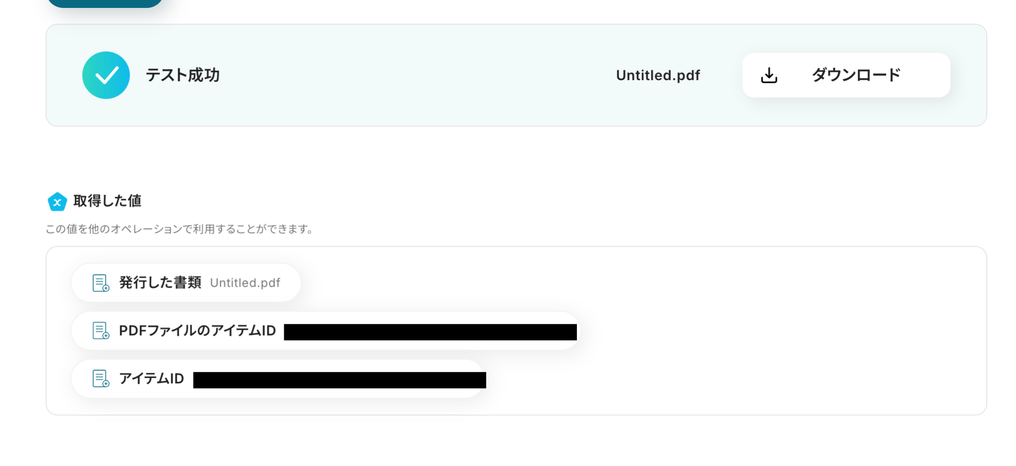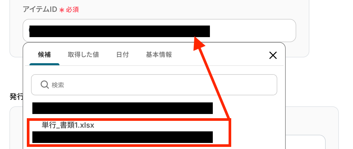 A : 「書類を発行する」アクションの発行書類の設定で、出力ファイル名を指定できます。 取得した値(フローの稼働ごとに更新される動的な値)や固定テキストを用いて、重複しないファイル名に設定してください。
