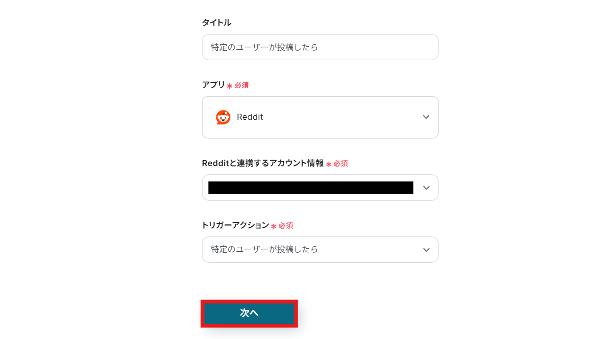 Redditと連携するアカウント情報は、マイアプリ連携したものが反映されています。タイトルは必要があれば、わかりやすいものに修正しておきましょう! アプリやアクションは変更せずに、「次へ」をクリックしてください。