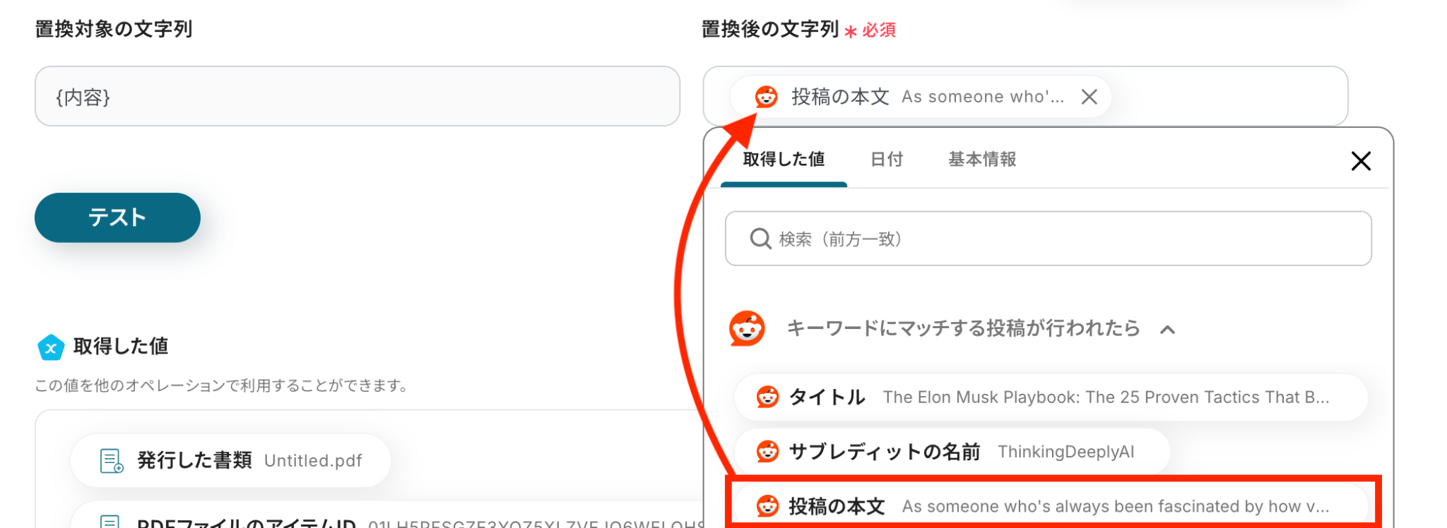 置換後の文字列に該当項目を設定し、テストを行いましょう。
