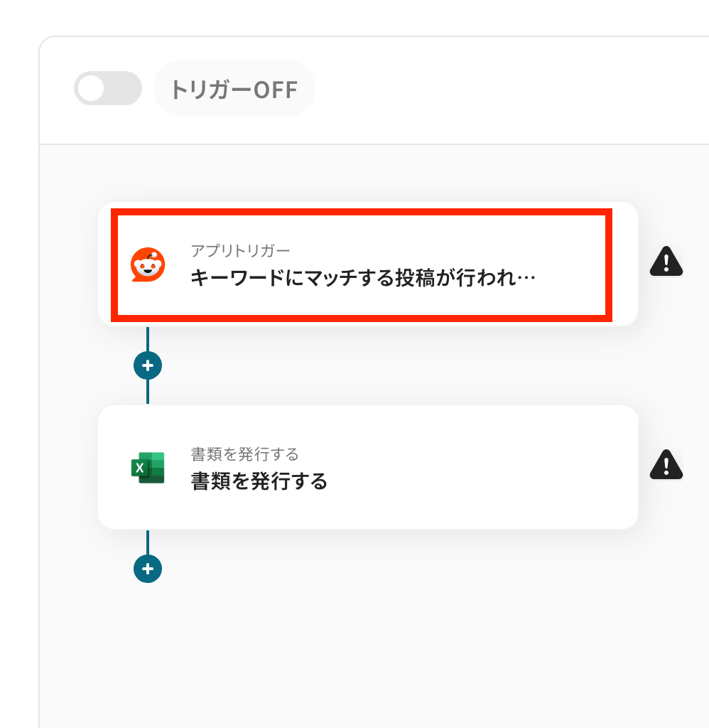 Redditのトリガー設定では、収集したい情報のキーワードを任意で設定してください。 書類発行機能では、OneDriveへ格納するPDFの雛形として任意のMicrosoft Excelファイルを使用でき、Redditから取得した投稿のタイトルや本文などを書類内の好きな箇所に差し込むことが可能です。 ■注意事項