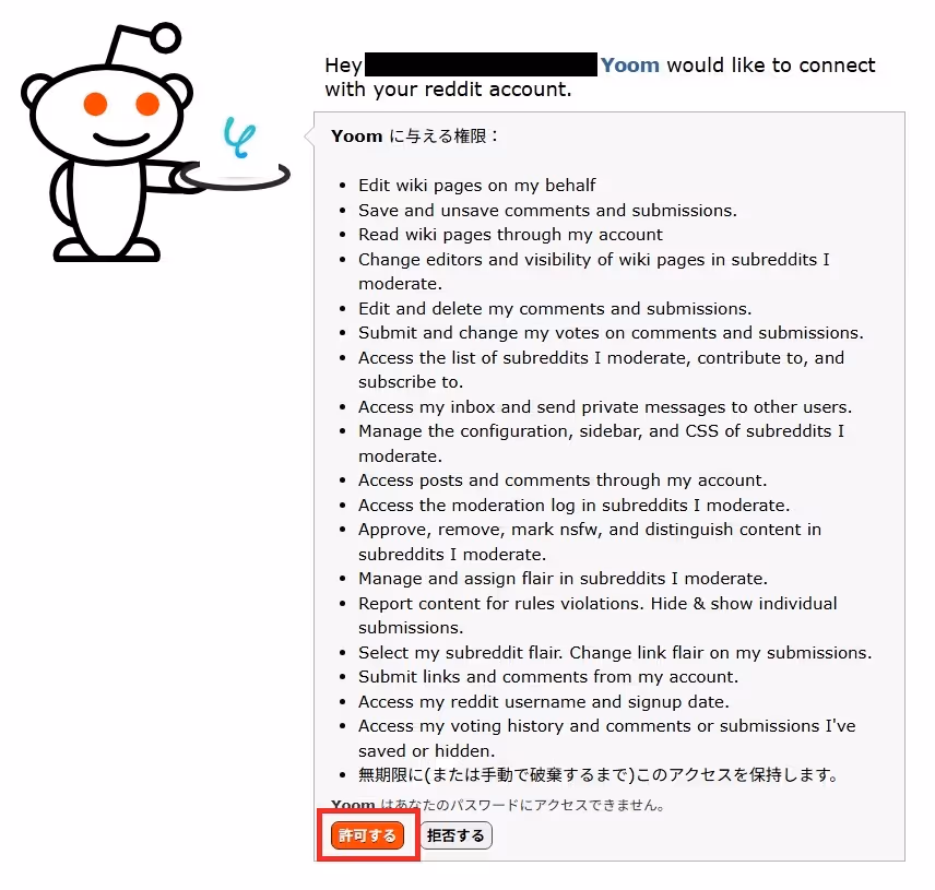 ログインするとYoomに与える権限事項のリストが表示されます。
