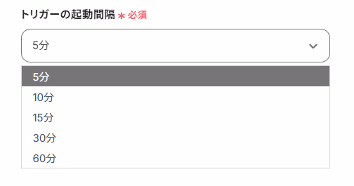 A:トリガーの起動間隔は5分、10分、15分、30分、60分から選択可能です。