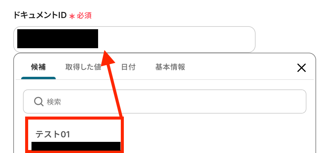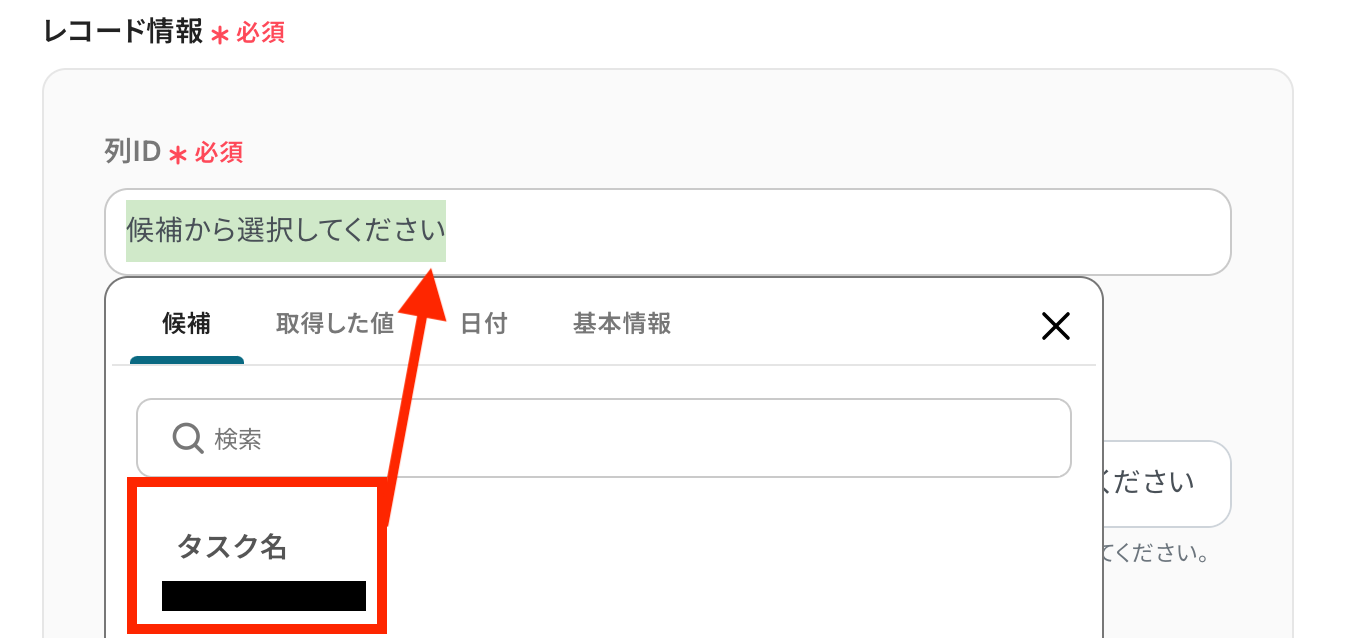 Codaで作成したテーブルの列の「列ID」を候補から選択してください。