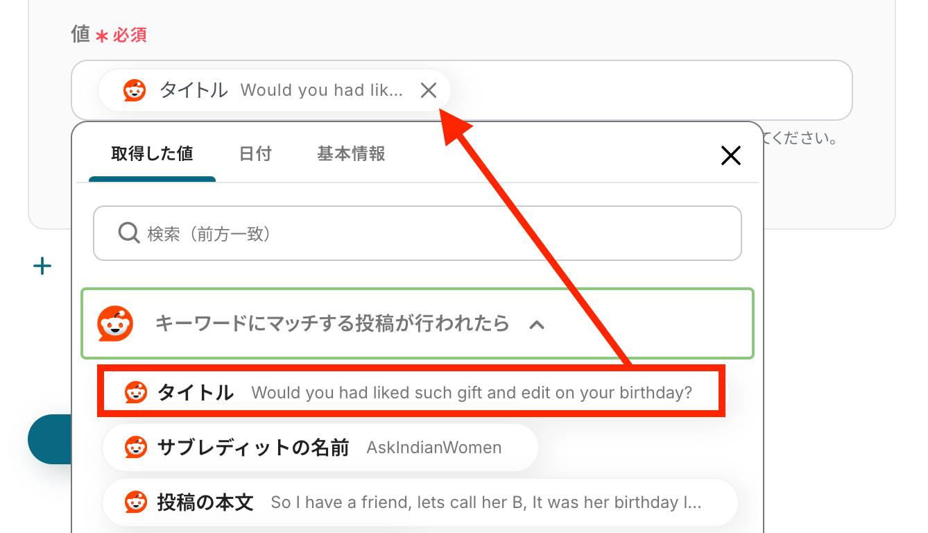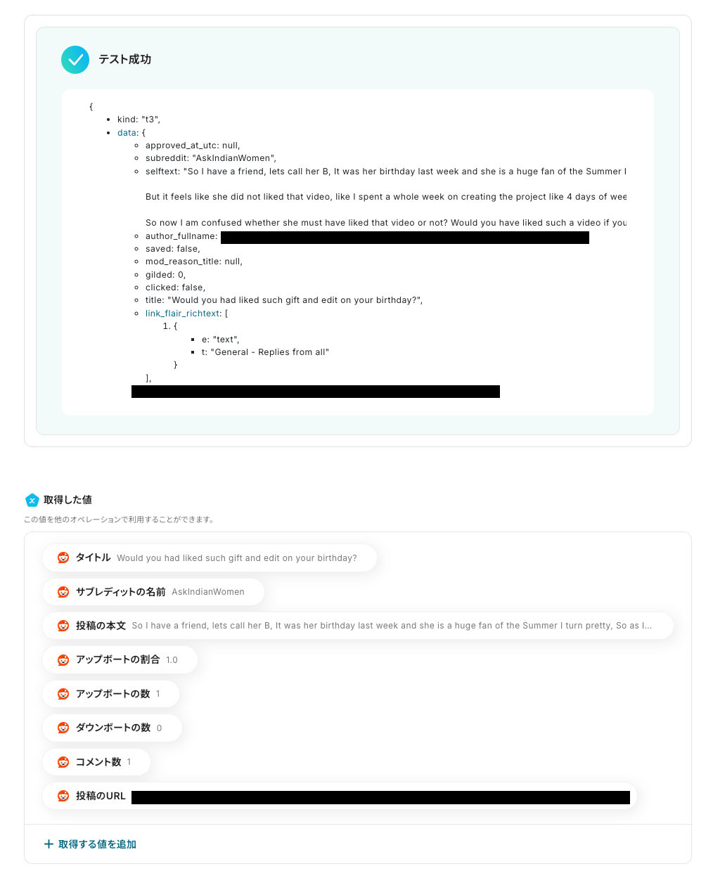テストに成功すると、このような画面が表示されます。Redditの情報が「取得した値」として反映されていることが分かります。