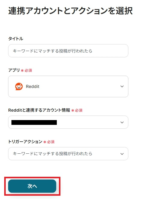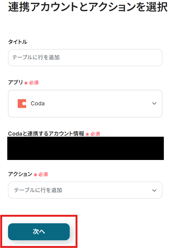 タイトルと連携するアカウント情報を確認し、アクションはテンプレート通りのまま「次へ」をクリックして進んでください。