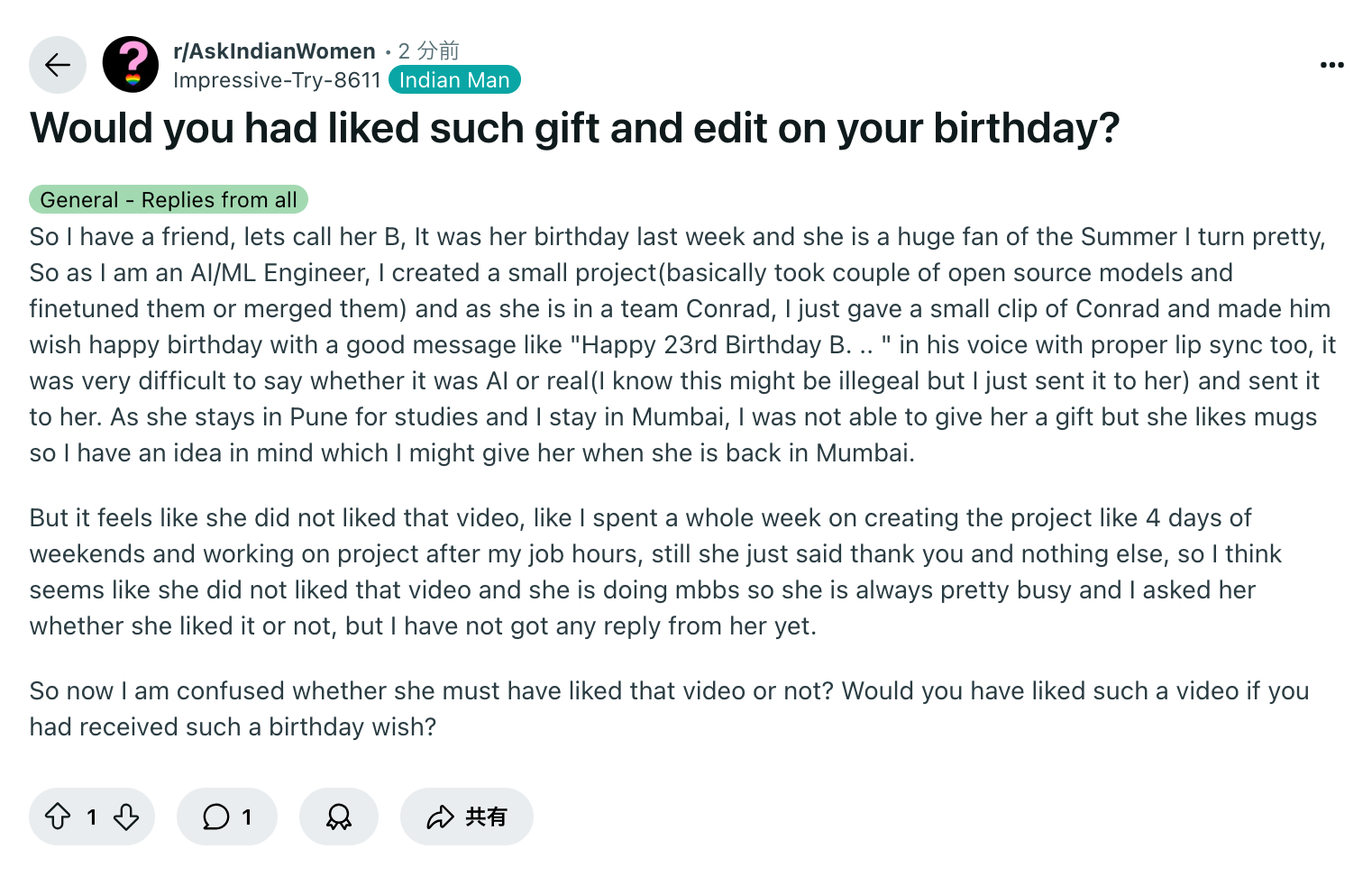 ※出典:上記の画像はReddit上のAskIndianWomenの投稿のスクリーンショットです。参考として引用させていただきます。(リンク)