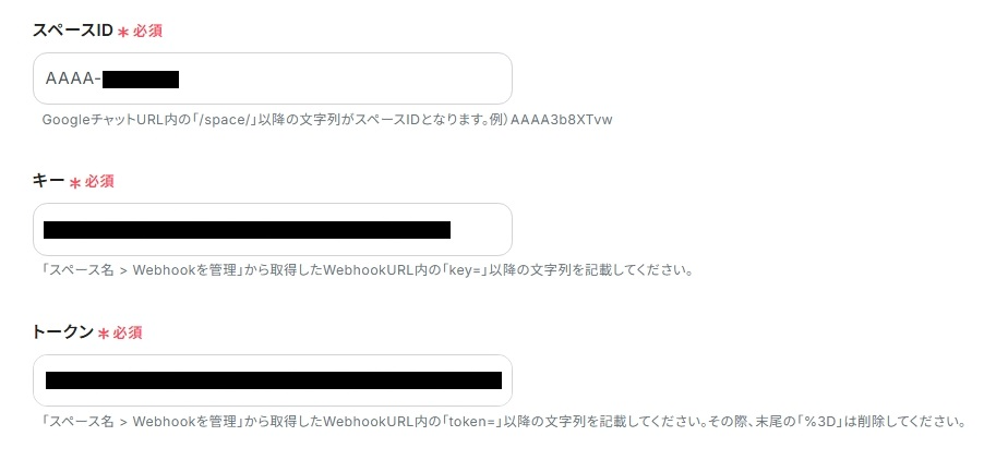 - スペースID / キー / トークン:こちら、または枠下の手順に従って各項目を入力してください。