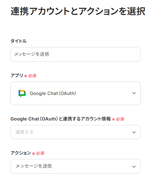 - メッセージ内容:入力欄をクリックすると前の工程で取得した値が表示されるので、Google Chatへ通知したい項目を選択しましょう。