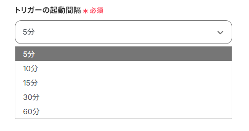 - トリガーの起動間隔:5分、10分、15分、30分、60分のいずれかで設定できます。