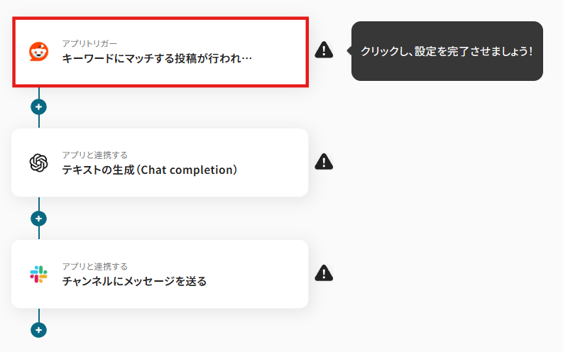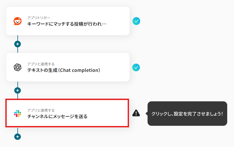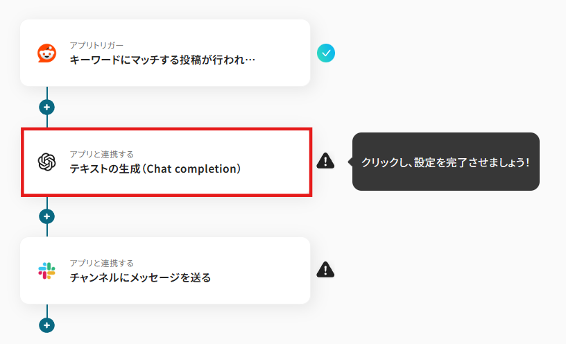 はじめに、Reddit、OpenAI、SlackをYoomと連携します。 次に、トリガーでRedditを選択し、「キーワードにマッチする投稿が行われたら」というアクションを設定し、監視したいキーワードを指定します。 次に、オペレーションでOpenAIの「テキストの生成(Chat completion)」アクションを設定し、トリガーで取得したRedditの投稿内容を要約するよう指示します。 最後に、オペレーションでSlackの「チャンネルにメッセージを送る」アクションを設定し、OpenAIが生成した要約を指定のチャンネルに通知します。 ※「トリガー」:フロー起動のきっかけとなるアクション、「オペレーション」:トリガー起動後、フロー内で処理を行うアクション