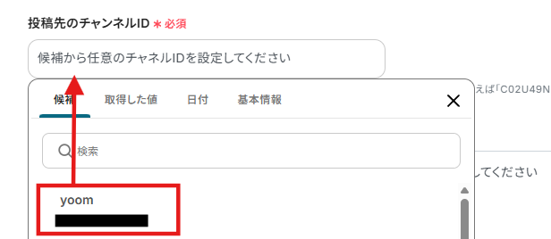 投稿先のチャンネルは以下のように表示される候補から選択しましょう。 設定するチャンネルには、Yoomのアプリがインストールされている必要があります。(SlackチャンネルにYoomアプリをインストールする方法 )