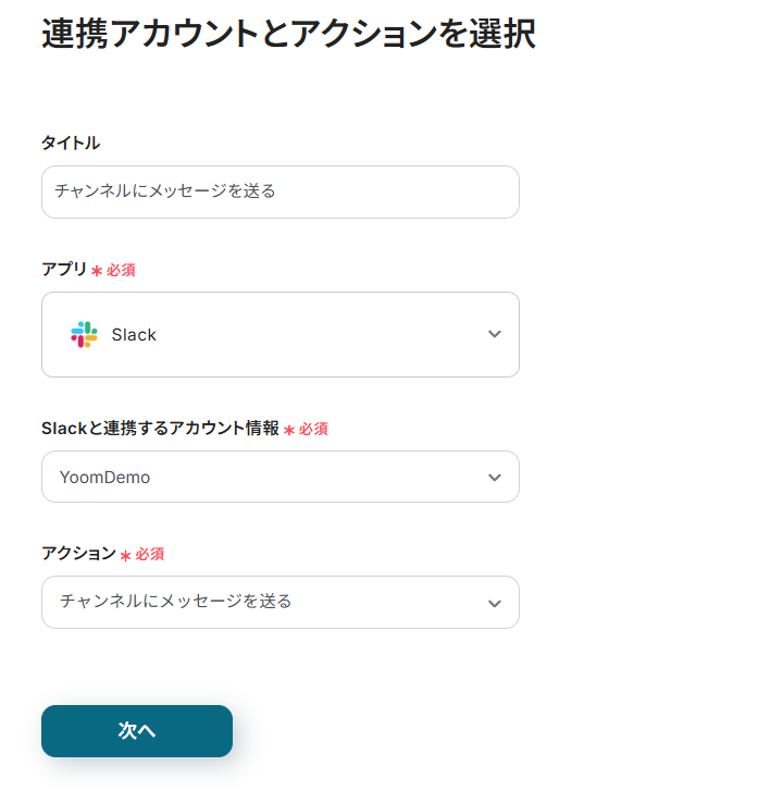 連携アカウントとアクションを選択する画面が表示されるので、今回連携するSlackのアカウントを確認し「次へ」をクリックします。