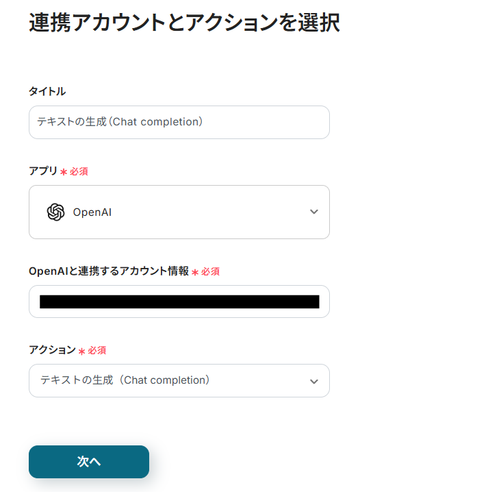 連携アカウントとアクションを選択する画面が表示されるので、今回連携するOpenAIのアカウントを確認し「次へ」をクリックします。