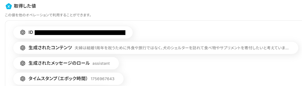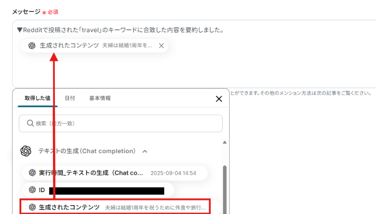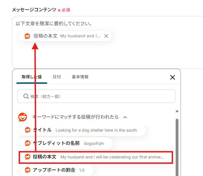 メッセージコンテンツには、以下のようにOpenAIへの指示と、「取得した値」からRedditの投稿の本文を入力しましょう。 取得した値を利用することで、自動化フローが起動するたびに、Redditから取得した情報が自動でOpenAIに反映されます。 直接入力した値は固定値になります。