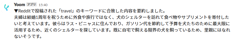 特定のキーワードを含む投稿がRedditで行われた際に、その投稿内容を自動で取得し、OpenAIが要約を作成して通知する連携です。