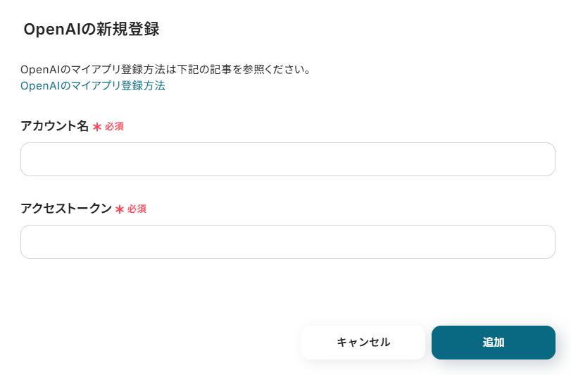 以下の画面が表示されるので、必要事項を入力しましょう。 ※OpenAIのマイアプリ登録方法についてはこちら をご確認ください。