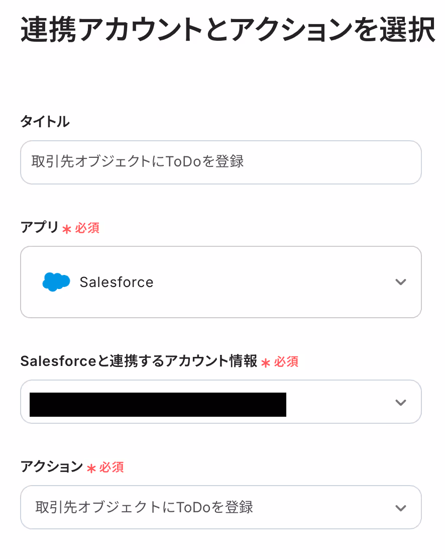 連携アカウントとアクションを選択する画面では、今回連携するSalesforceのアカウントで間違いないかを確認し、「次へ」をクリックします。