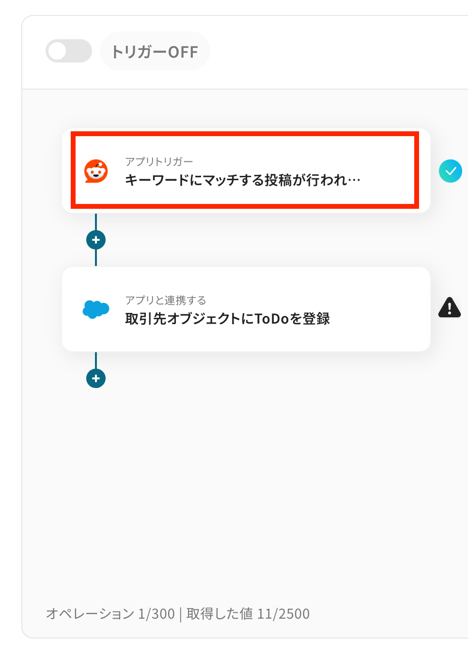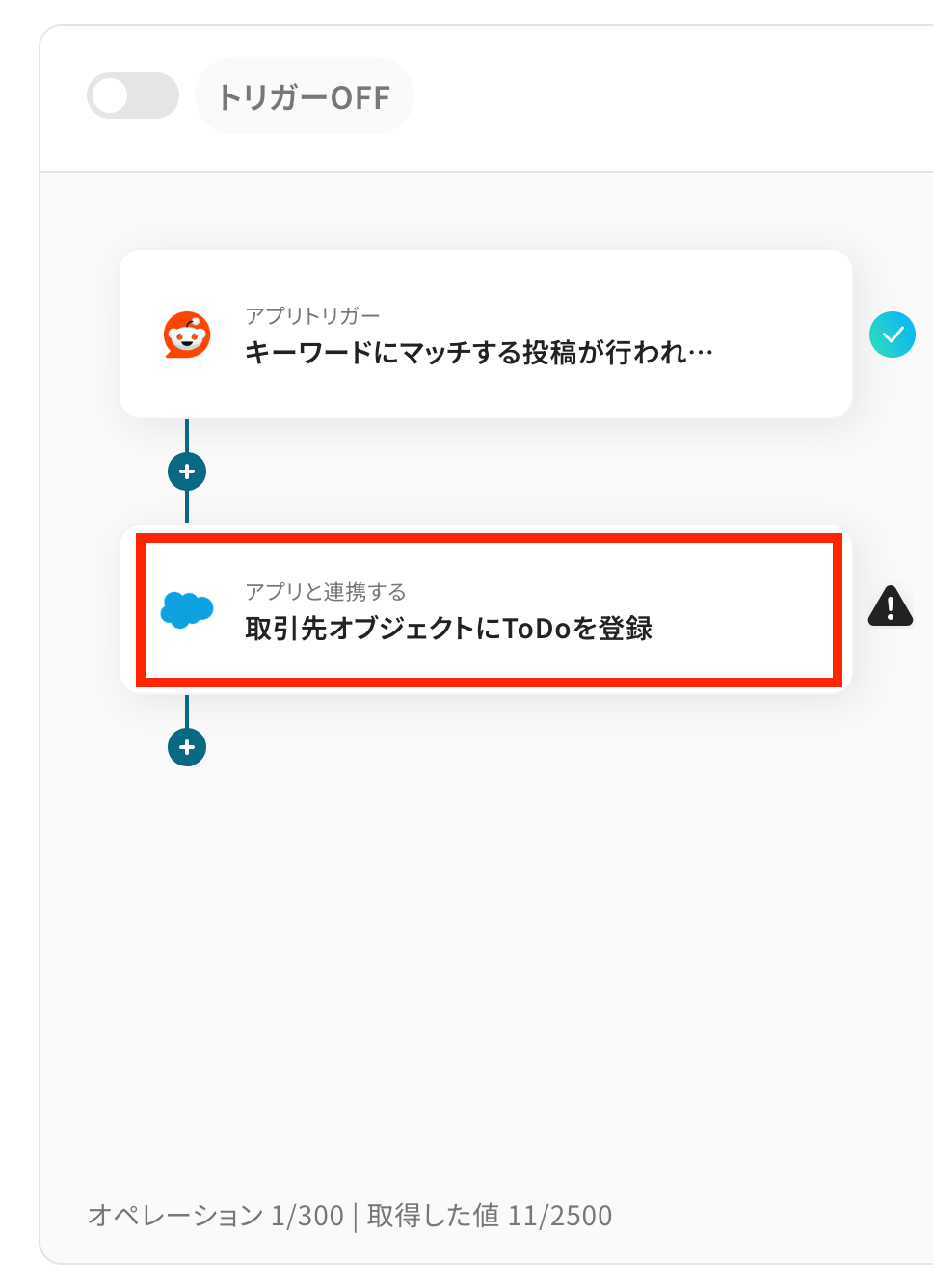 このワークフローを活用すれば、Redditで特定のキーワードにマッチする投稿があった際に、自動でSalesforceの取引先にTo Doを登録し、情報収集から次のアクションへの連携をスムーズに自動化します。