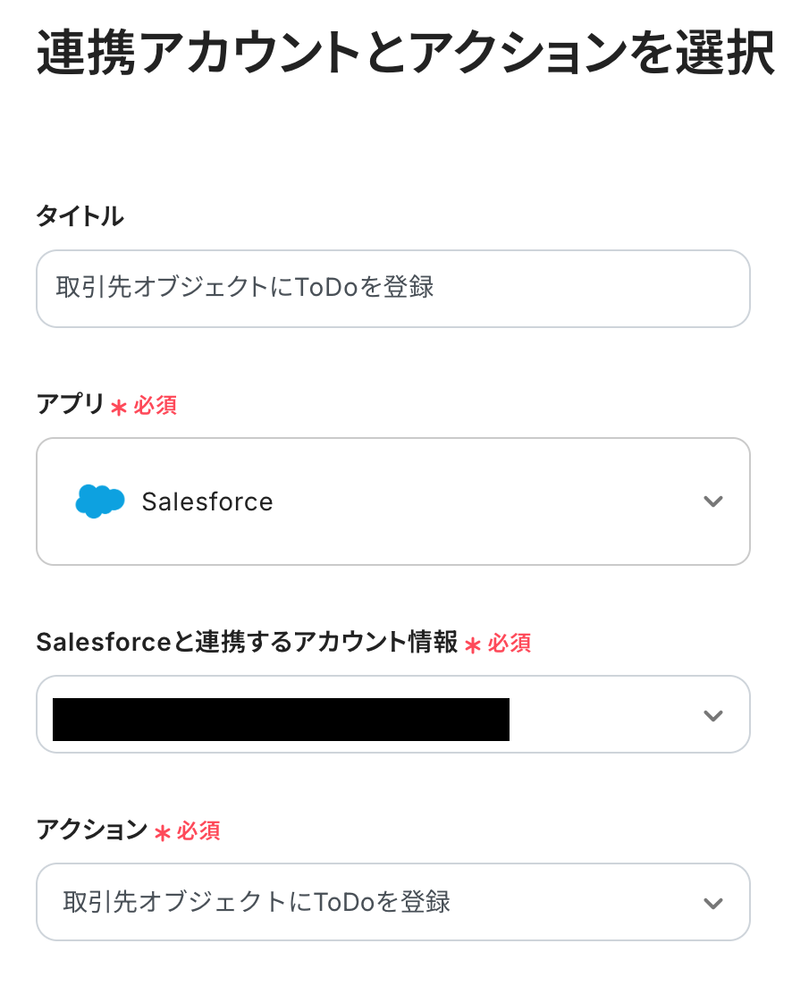 - 最後に、オペレーションでSalesforceを選択し、「取引先オブジェクトにTo Doを登録する」アクションを設定することで、関連する取引先にTo Doが自動で登録されます