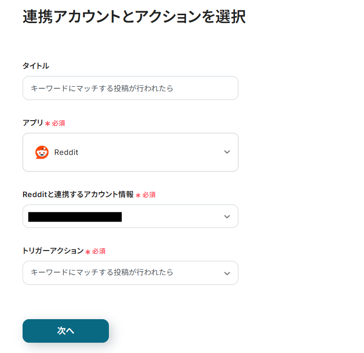 連携アカウントとアクションを選択する画面が表示されるので、今回連携するRedditのアカウントを確認し「次へ」をクリックします。