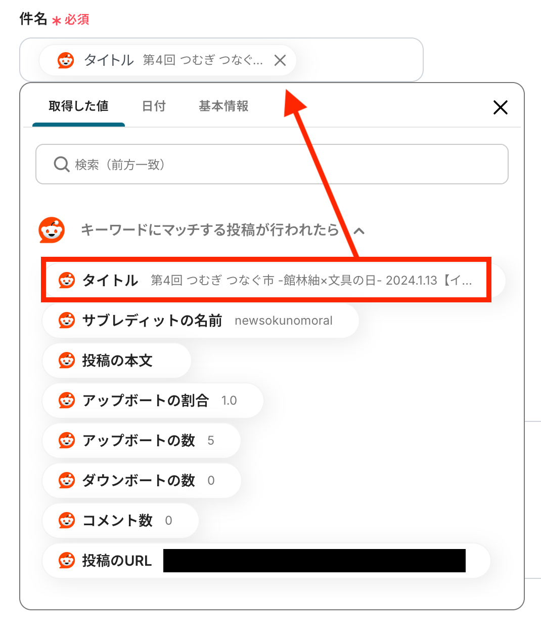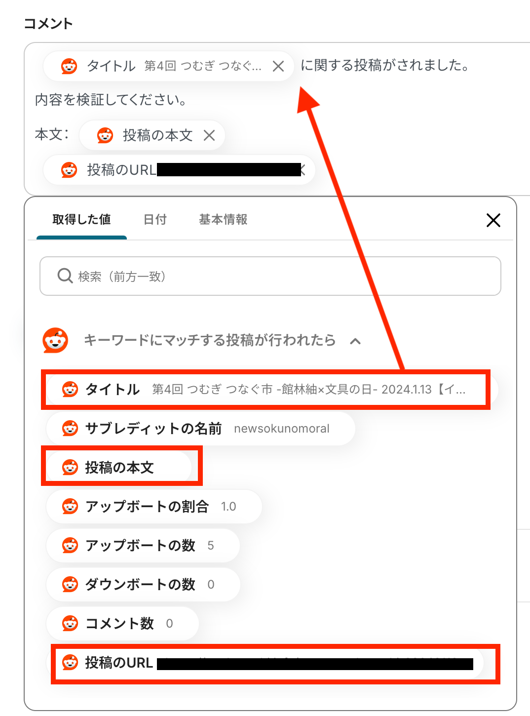 - 次に、トリガーでRedditを選択し、「キーワードにマッチする投稿が行われたら」というアクションを設定します。この際、監視したいキーワード(自社名、製品名など)を指定します。