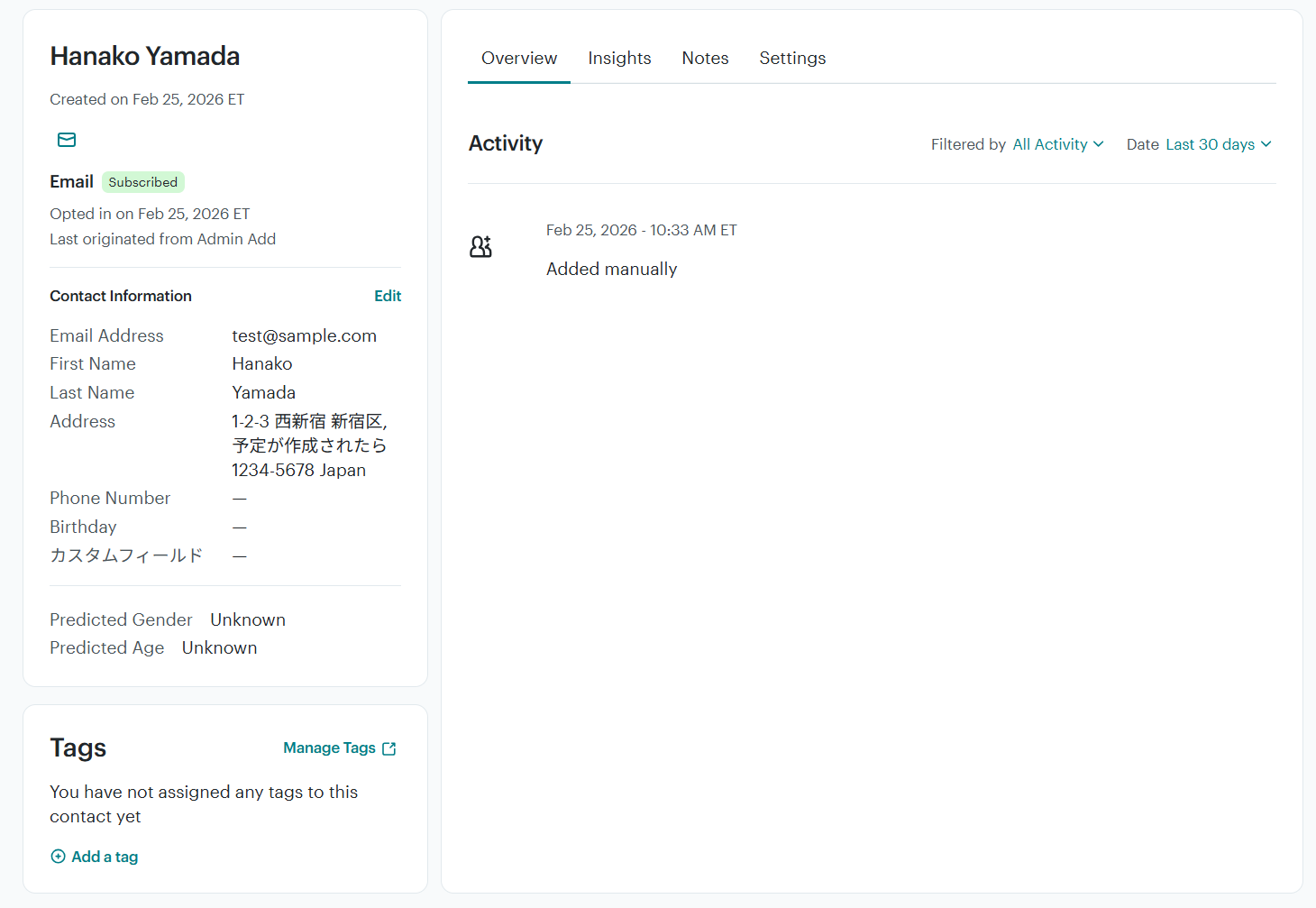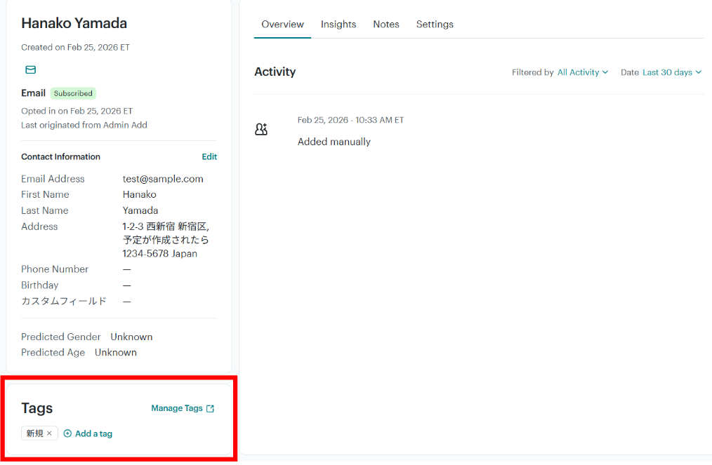 テストに成功すると、MailchimpのTagsに情報が反映されます!
