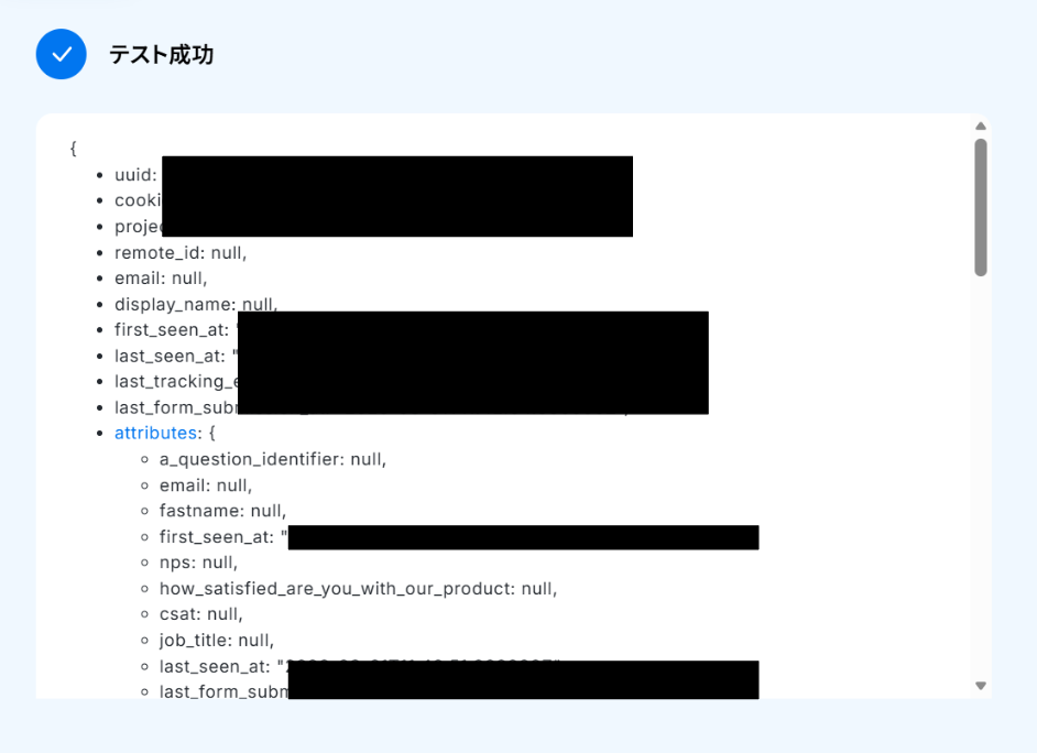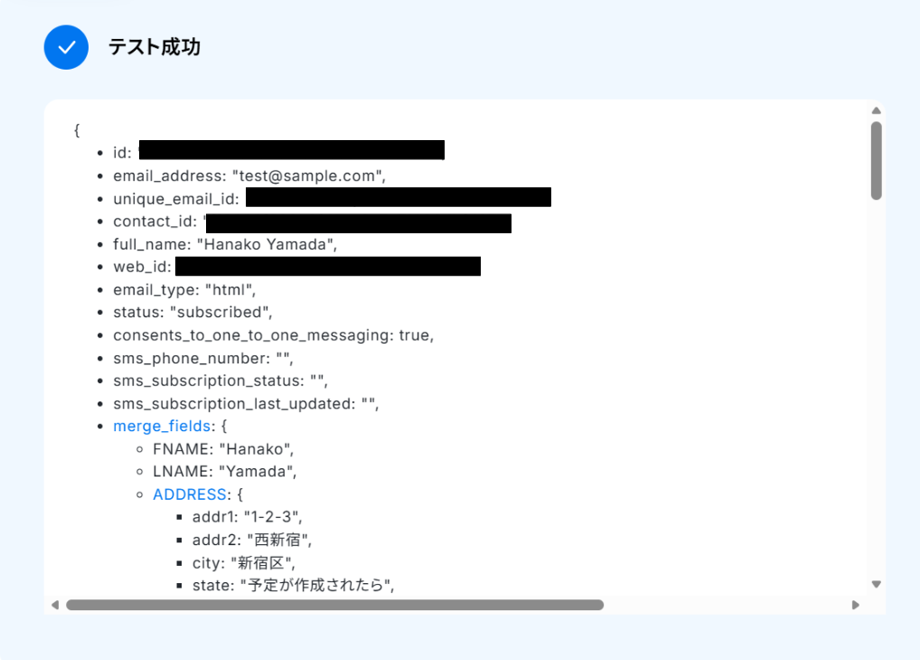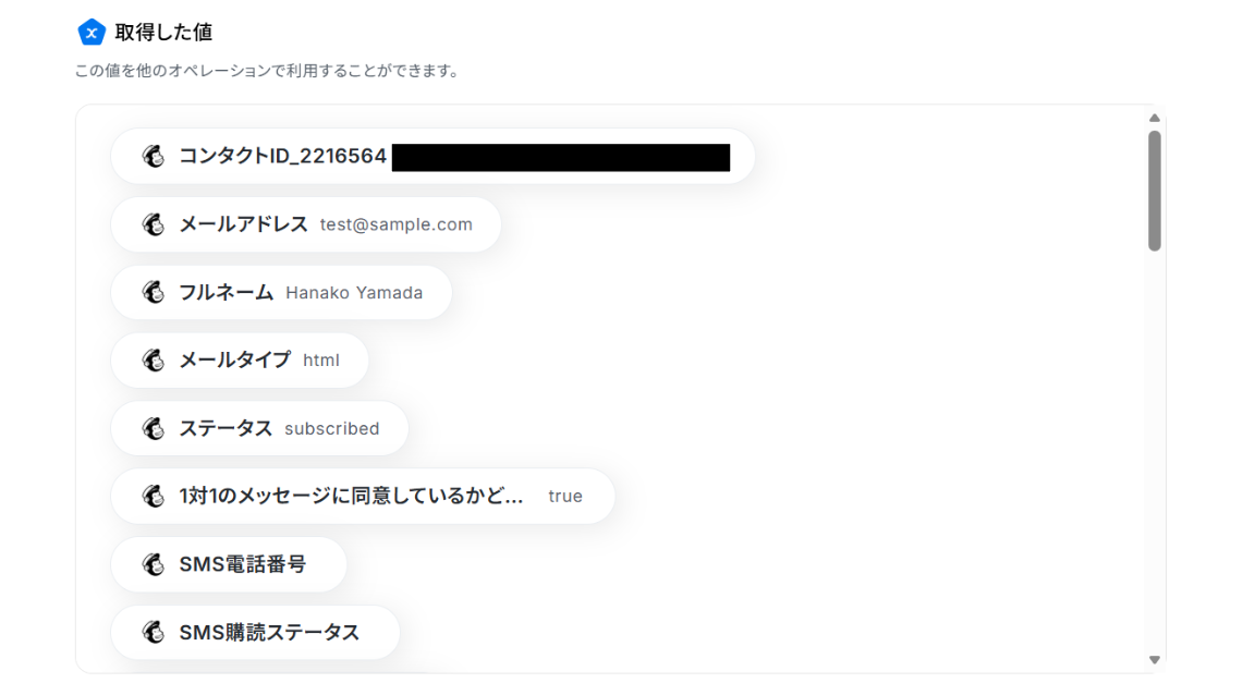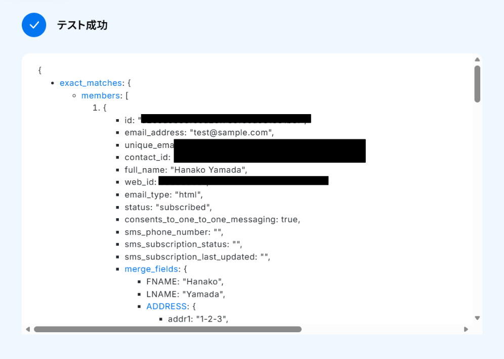 テストに成功すると「取得した値」にMailchimpのコンタクト情報が反映されます。