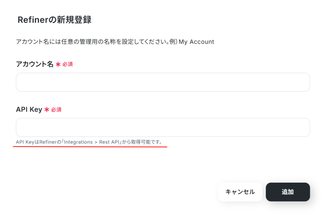 - API Key:Refinerにログインし、赤枠内の説明を参考にAPI Keyを取得し入力