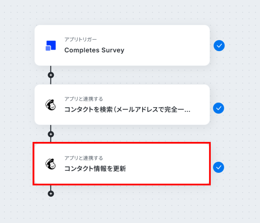 - 最後に、オペレーションでMailchimpの「コンタクト情報を更新」アクションを設定し、トリガーで取得した情報をもとに、タグの追加や情報の更新を行うよう設定します。