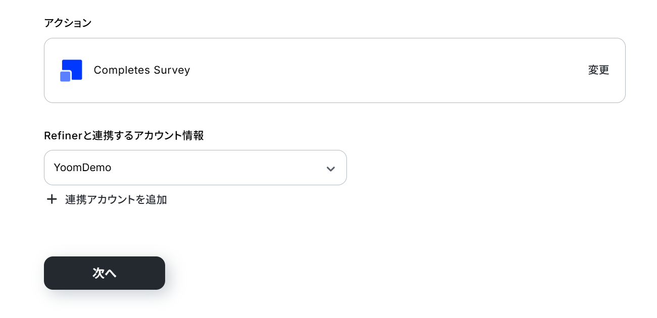 (2)Refinerと連携するアカウント情報に誤りがないかを確認し、アクションは「Completes Survey」のままで「次へ」をクリックしましょう。