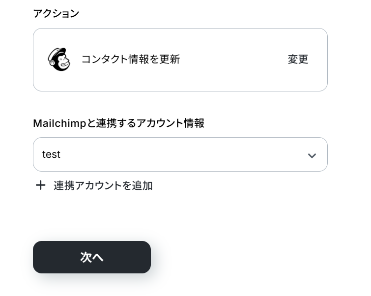 (2)Mailchimpと連携するアカウント情報に誤りがないかを確認し、アクションは「コンタクト情報を更新」のままで「次へ」をクリックしましょう。