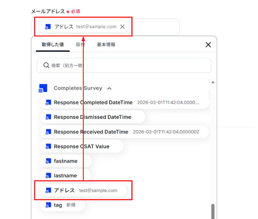 (3)「メールアドレス」にRefinerで取得した値を使って入力します。