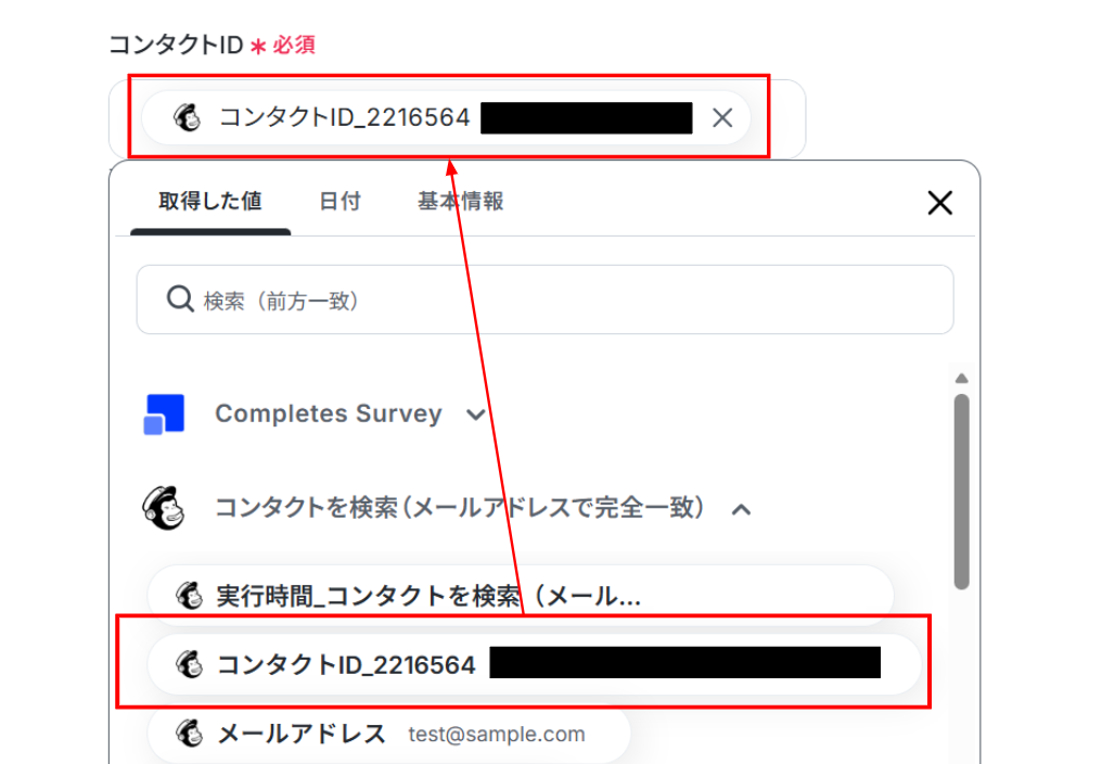 「コンタクトID」はMailchimpで取得した「コンタクトID」を使って入力します。