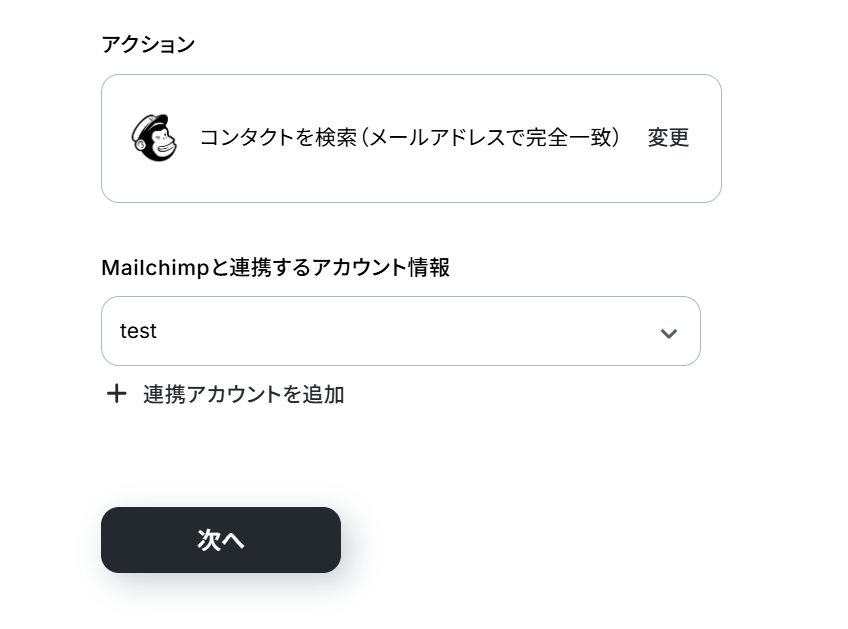 (2)Mailchimpと連携するアカウント情報に誤りがないかを確認し、アクションは「コンタクトを検索(メールアドレスで完全一致)」のままで「次へ」をクリックしましょう。