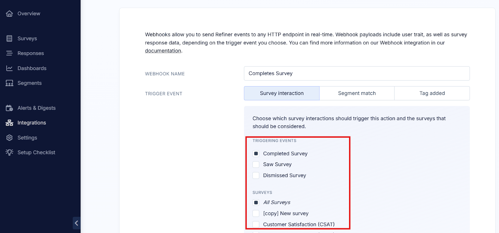 - 次に、トリガーでRefinerを選択し、「Completes Survey」というアクションを設定します。