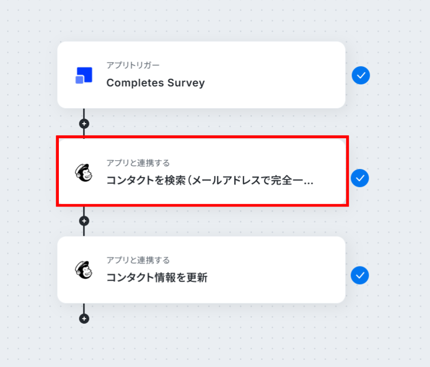 - 続いて、 オペレーションでMailchimpの「コンタクトを検索(メールアドレスで完全一致)」アクションを設定し、対象のコンタクトを特定します。