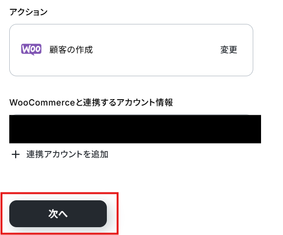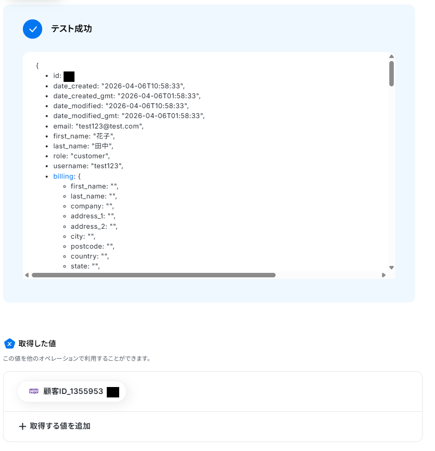取得した値は、フローボットを起動する度に変動した値となります。取得した値を活用することで、フローボットが起動するたび、変動した値を反映してWooCommerceに顧客を作成できます。