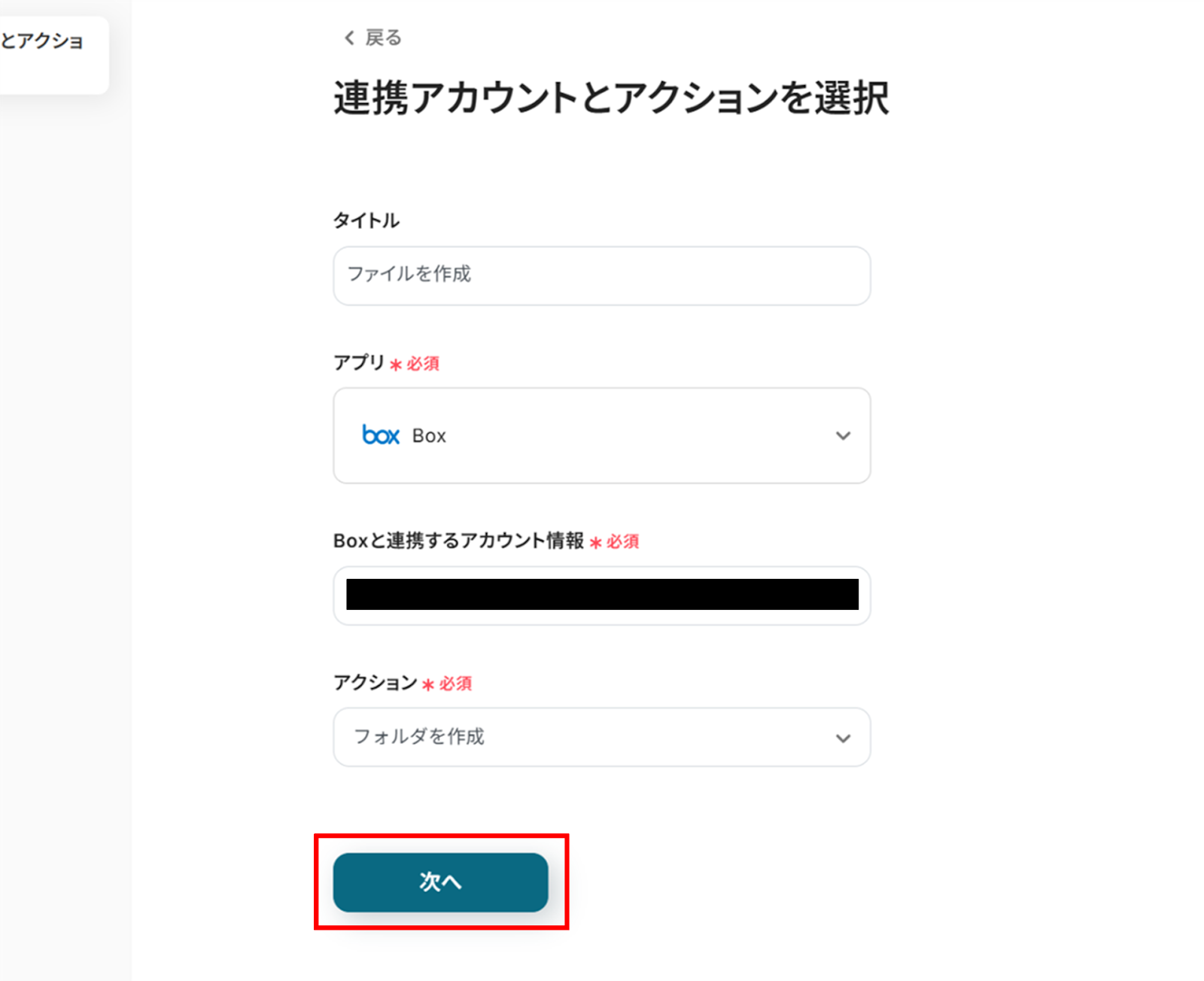 (2)「連携アカウントとアクションを選択」画面から、Boxと連携するアカウント情報に誤りがないかを確認し、アクションは「ファイルを作成」のままで「次へ」をクリックします。