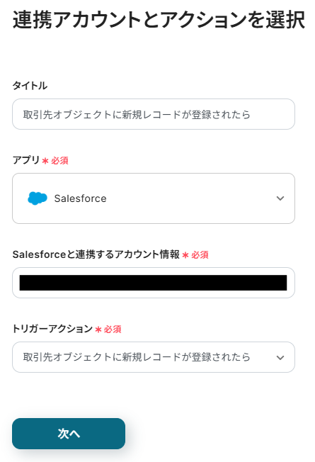 タイトルと連携するアカウント情報を任意で設定し、トリガーアクションはテンプレート通りに「取引先オブジェクトに新規レコードが登録されたら」のまま「次へ」をクリックして進んでください。