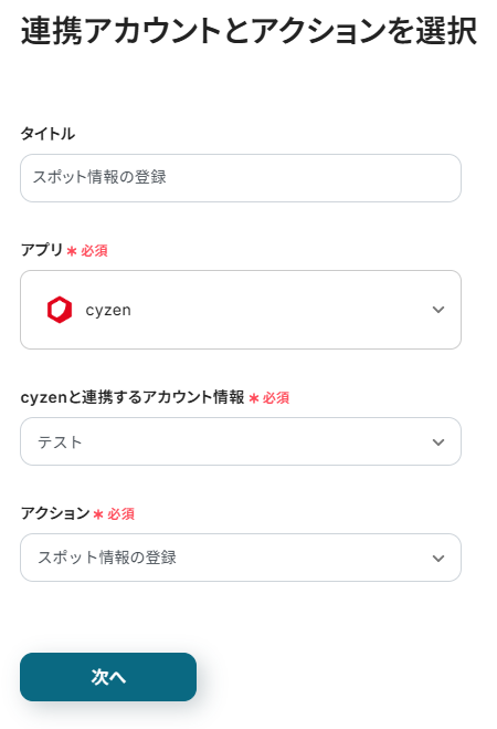 先ほどと同様にタイトルと連携するアカウント情報を任意で設定し、アクションはテンプレート通りに「スポット情報の登録」のまま「次へ」をクリックして進んでください。