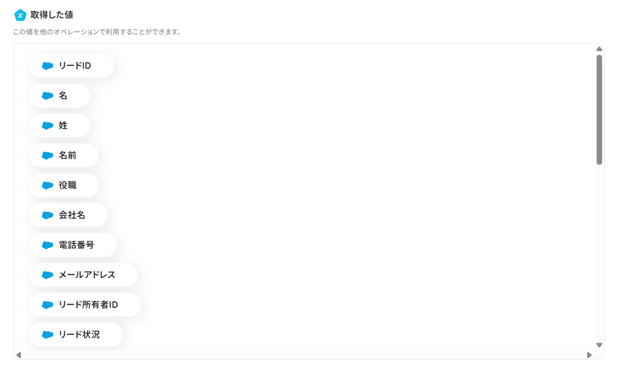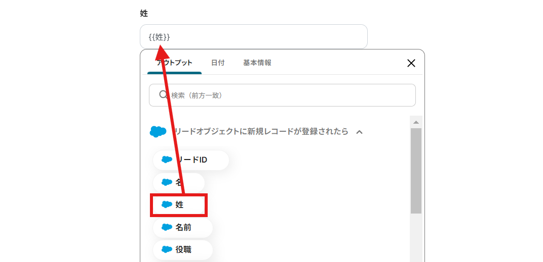 各項目は入力欄をクリック すると、以下の画像のように先ほどSalesforceで取得した情報が表示されるので、活用してください。