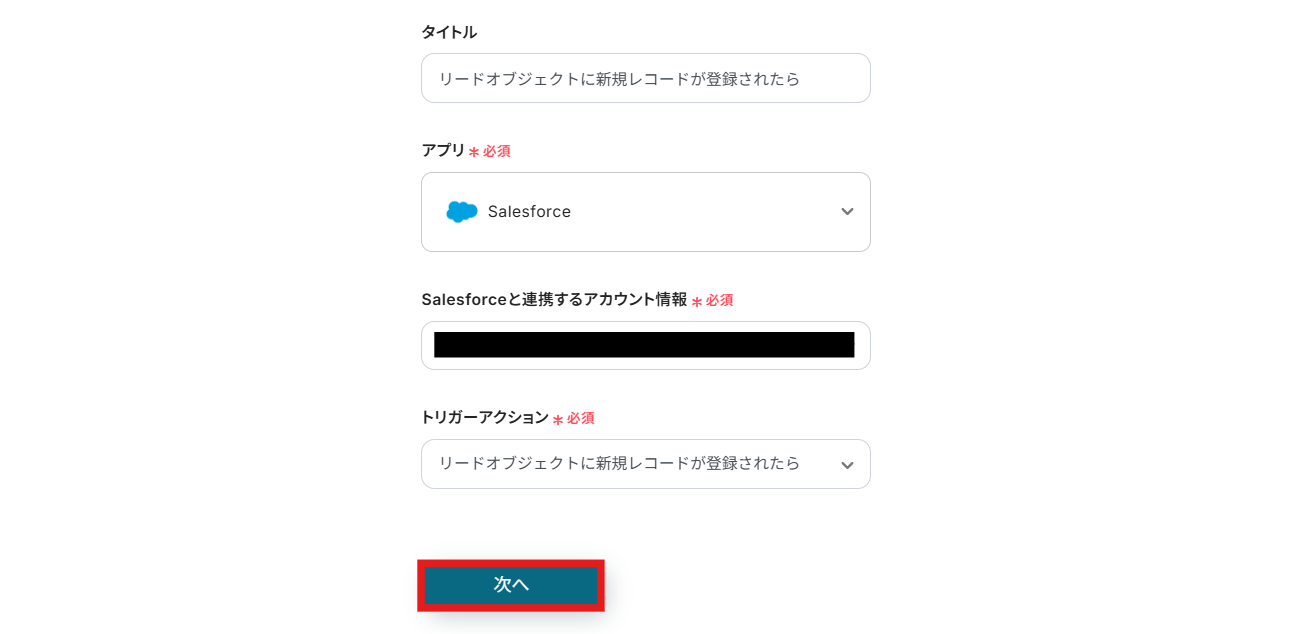 先ほどと同様に、タイトルやアカウント情報を確認して、問題がなければ「次へ」をクリックします。