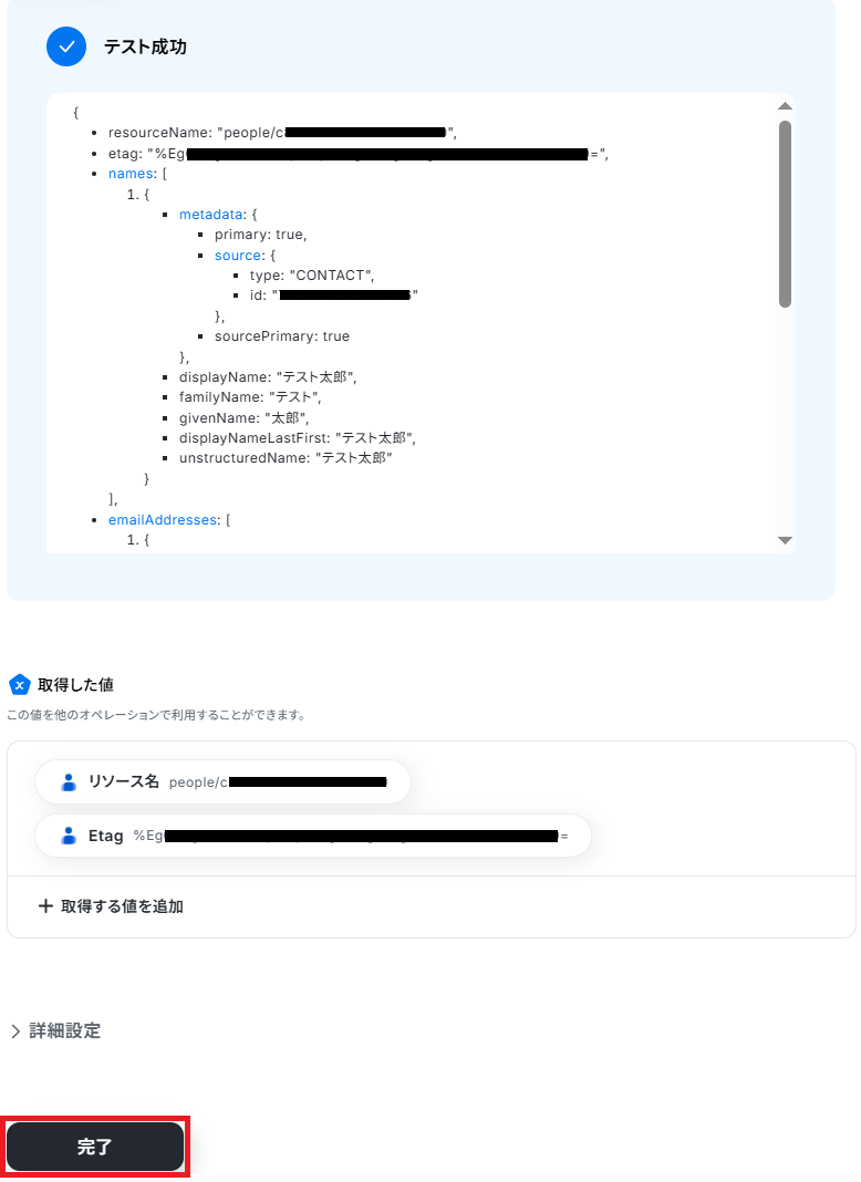 登録したい項目を設定し終えたらテストしてください。