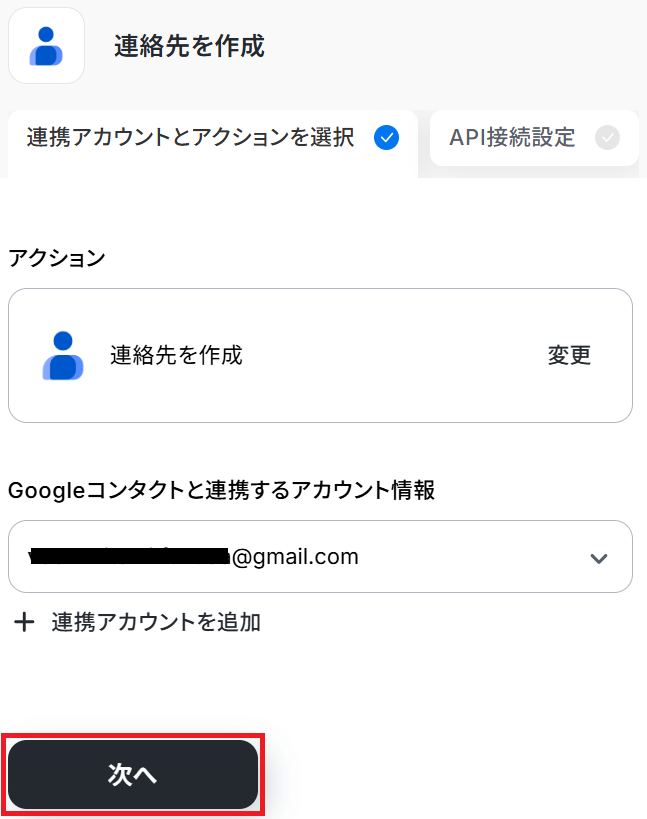 ステップ3と同様、アクションは「連絡先を作成」のまま「次へ」をクリックします。