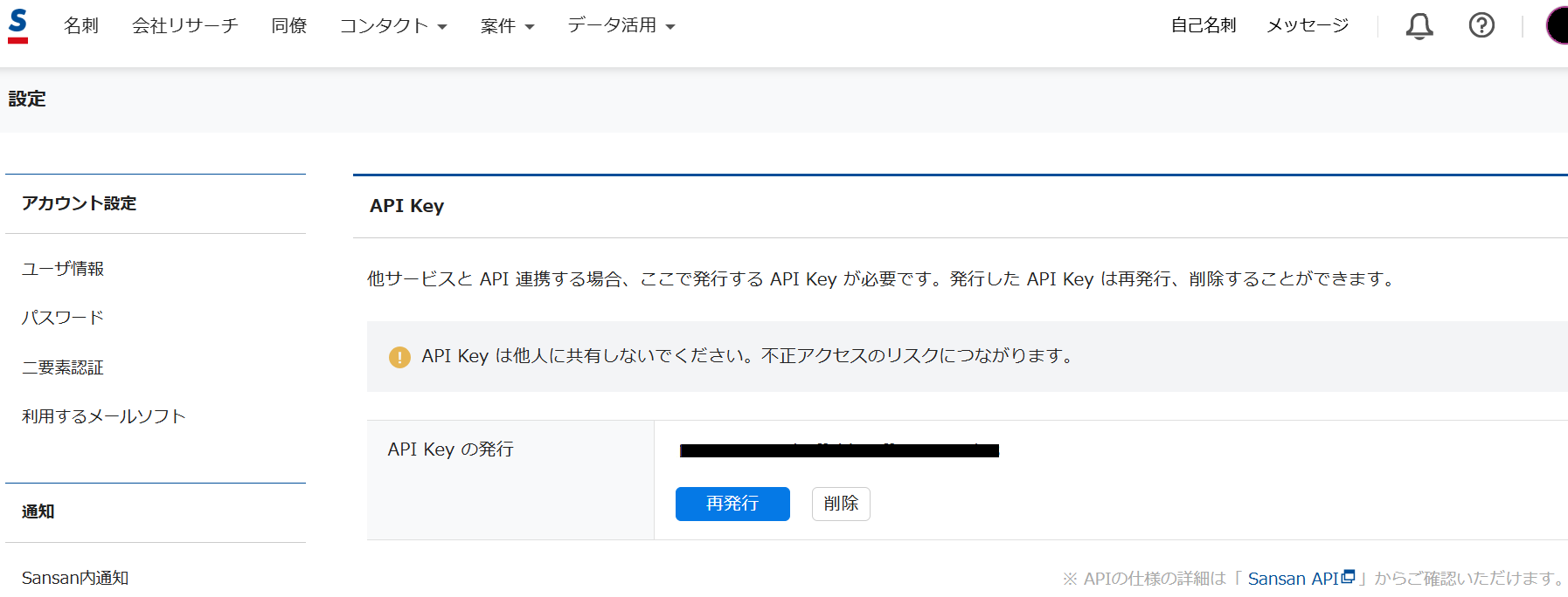 それではここからSansanのマイアプリ登録方法を解説します。 まずSansanにログインし、設定 →外部サービス連携設定 →API Key と進んでください。 そこでAPI Key を発行できます。