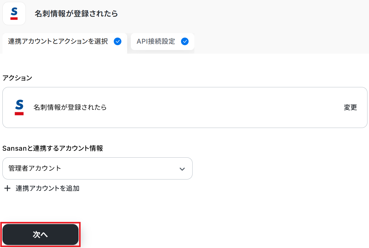 タイトル と連携するアカウント情報 を任意で設定し、アクションはテンプレート通りに「名刺情報が登録されたら」のまま「次へ」をクリックします。