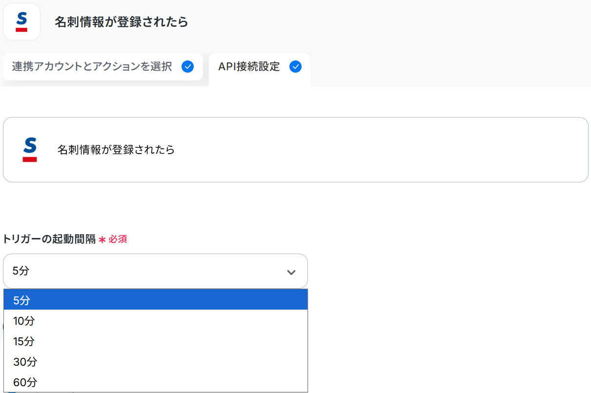 Sansan、GoogleコンタクトのそれぞれとYoomを連携してください。 トリガーは5分、10分、15分、30分、60分の間隔で起動間隔を選択できます。 プランによって最短の起動間隔が異なりますので、ご注意ください。 Sansanはチームプラン・サクセスプランでのみご利用いただけるアプリとなっております。フリープラン・ミニプランの場合は設定しているフローボットのオペレーションやデータコネクトはエラーとなりますので、ご注意ください。 チームプランやサクセスプランなどの有料プランは、2週間の無料トライアルを行うことが可能です。無料トライアル中には制限対象のアプリを使用することができます。